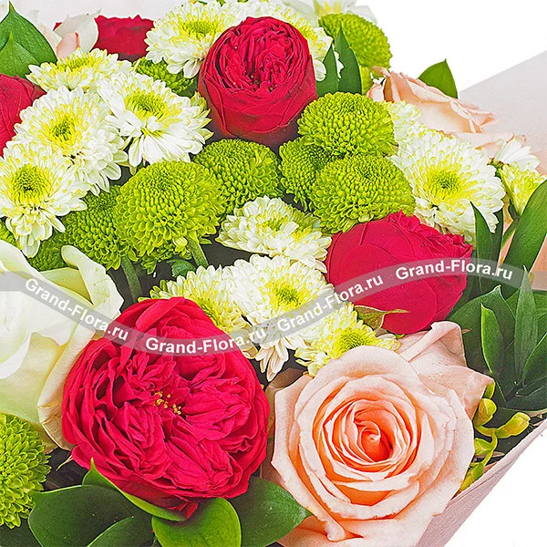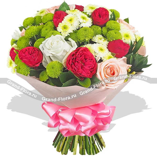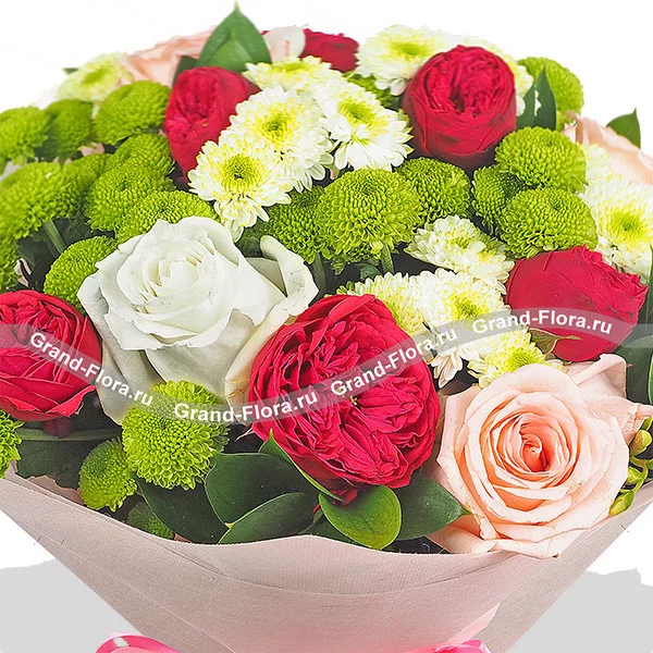Роза красная - 13 шт., роза розовая - 7 шт., роза белая - 5 шт., хризантема кустовая зеленая - 7 шт., хризантема кустовая белая - 5 шт., фрезия - 4 шт., рускус, фетр розовый.